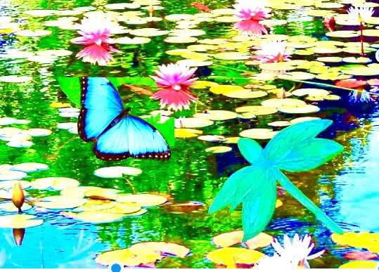 In the heart of a well loved garden, which dwelt within the stone walls of the estate of the café du memorie. Sunlight filtered through the leaves of the overhanging grape vines like golden threads and cast dappled light upon the ancient pond. From amongst the floating water lilies a tiny dragonfly emerged. Born in the water, she was also a creature of dual existence, a child of water and air. Her wings, still damp and translucent, clung to her delicate body as she clambered onto a lily pad.
