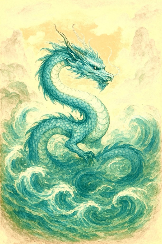 • Lóngyuè, the Water Dragon, emerged from moonlight touching seafoam.